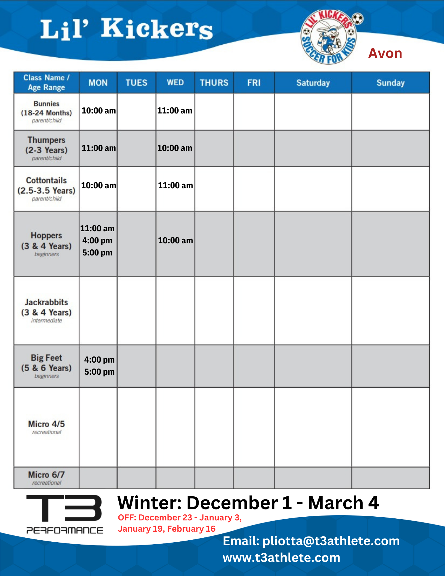 Cost: $18/week + an annual registration fee, which includes your Lil’ Kickers Jersey!