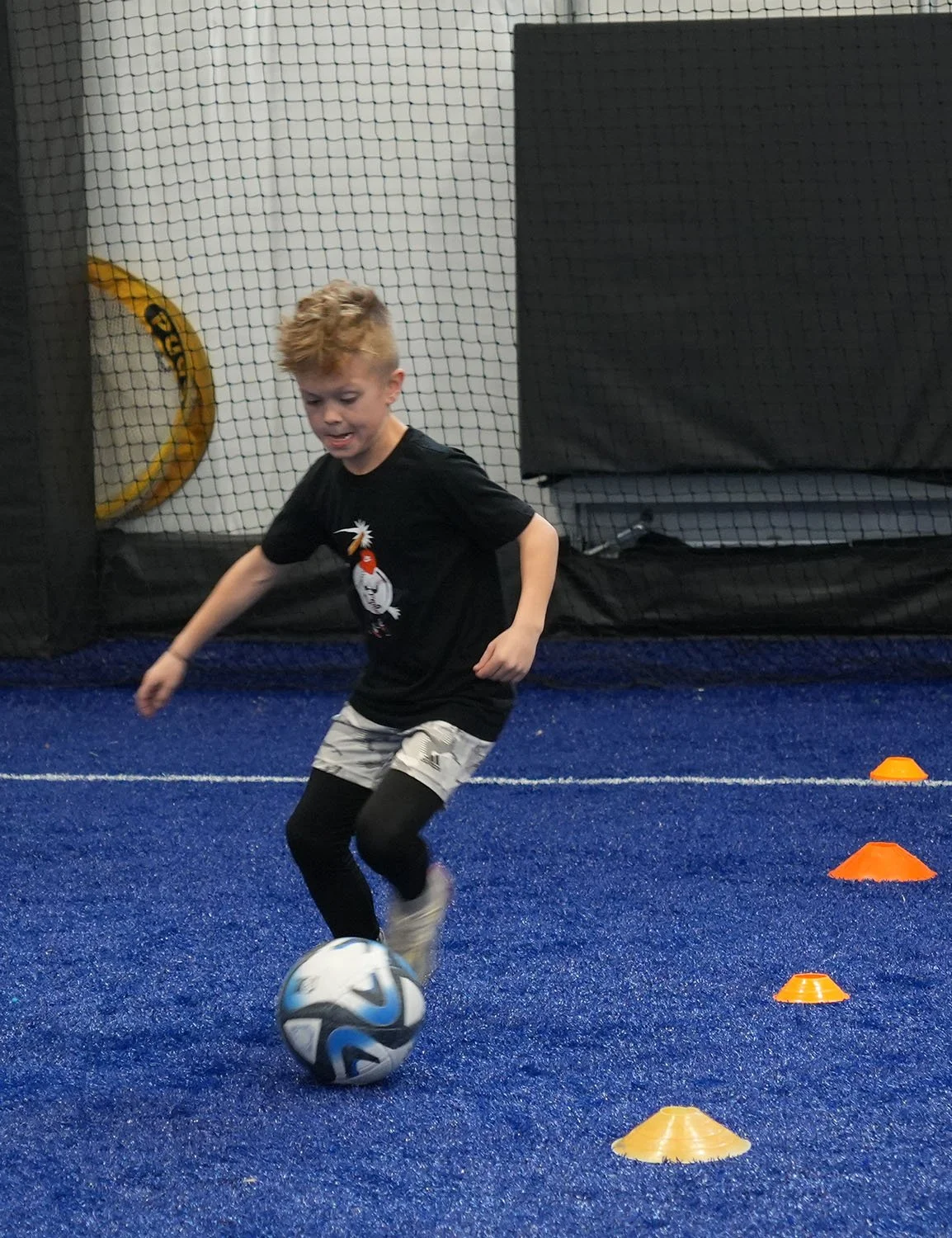 Athletes perform speed and agility drills with the ball at their feet. They learn to weave through obstacles and execute technical skills at pace.